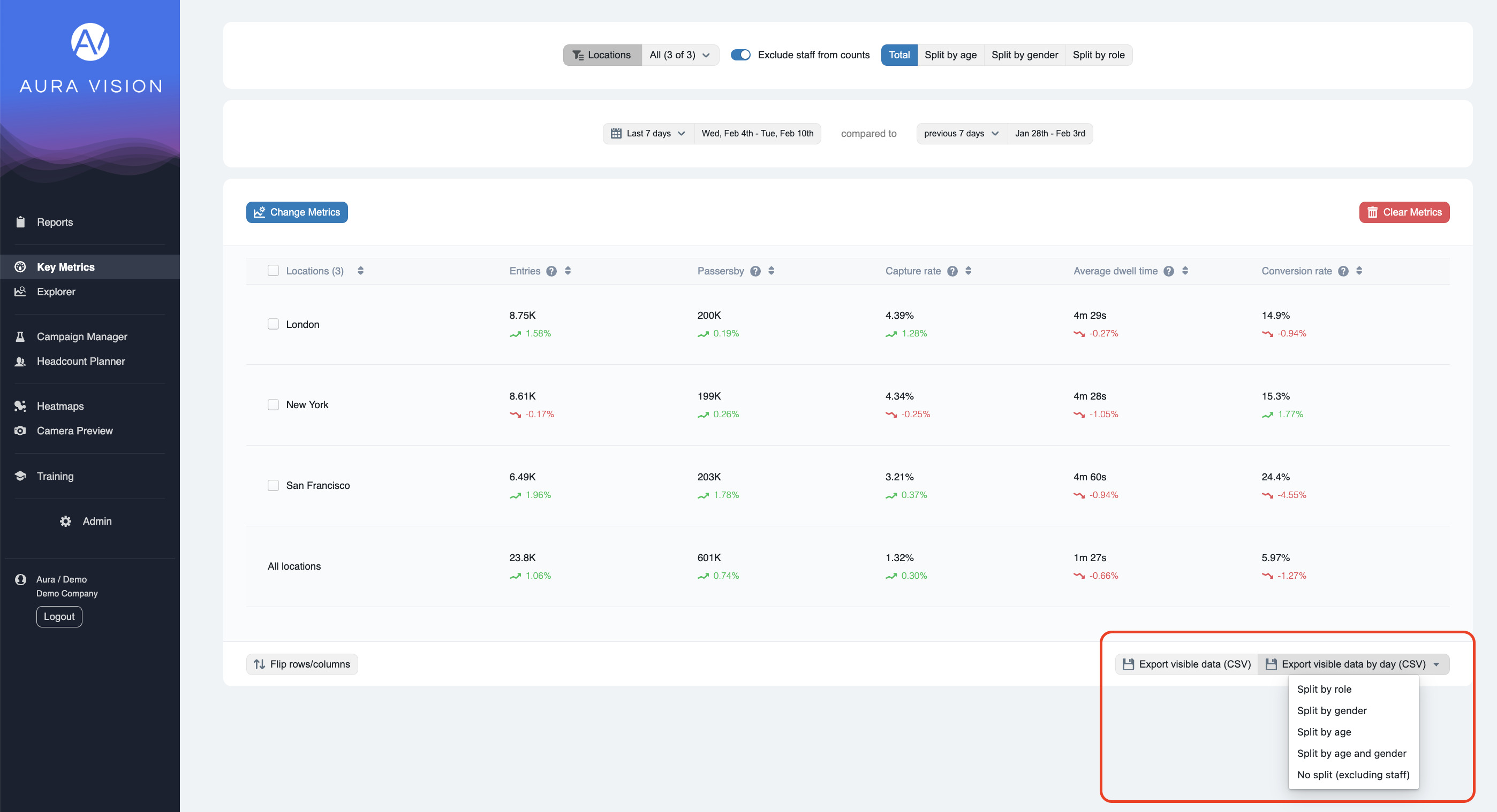 Export Visible data by day : no split ( Excluding staff) | A daily breakdown with no demographic splits - staff are removed by default |
