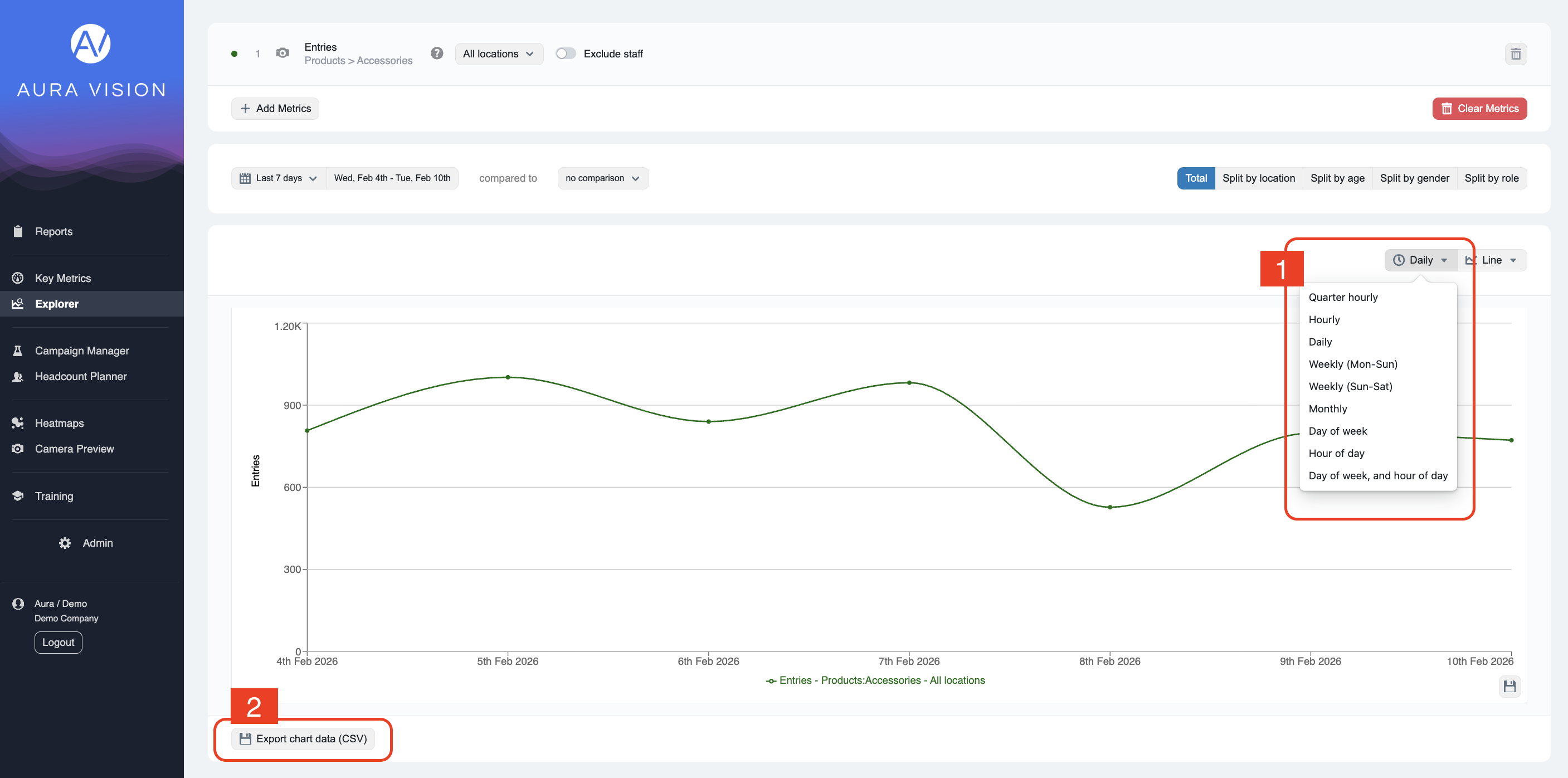 Day of Week | Ideal for identifying daily trends. Works best when selecting 2 or more weeks |