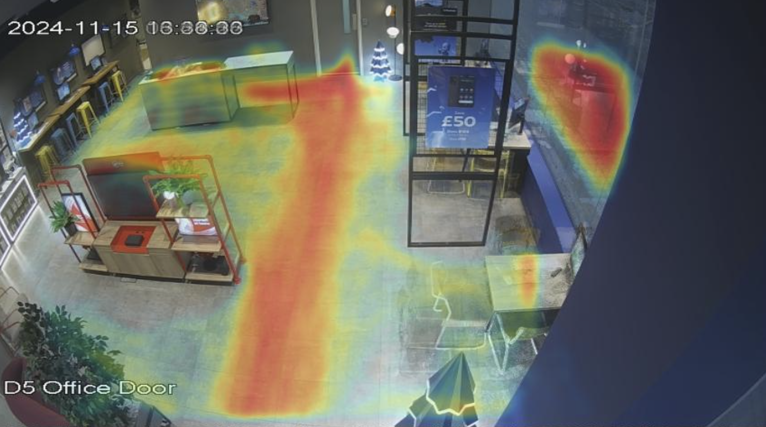 A Total time heatmap shows where customers spend time in the store. Red areas are the areas that have the highest dwell time. We plot dwell time in the total time heatmap once the person has been in the area for more than 5 seconds.