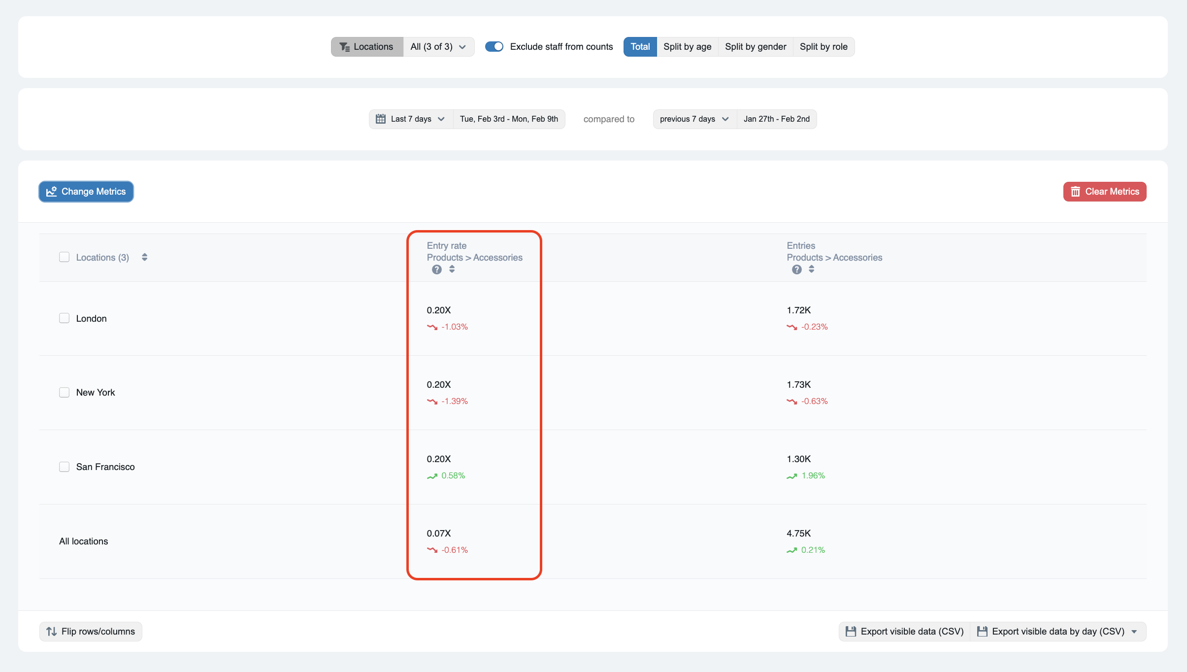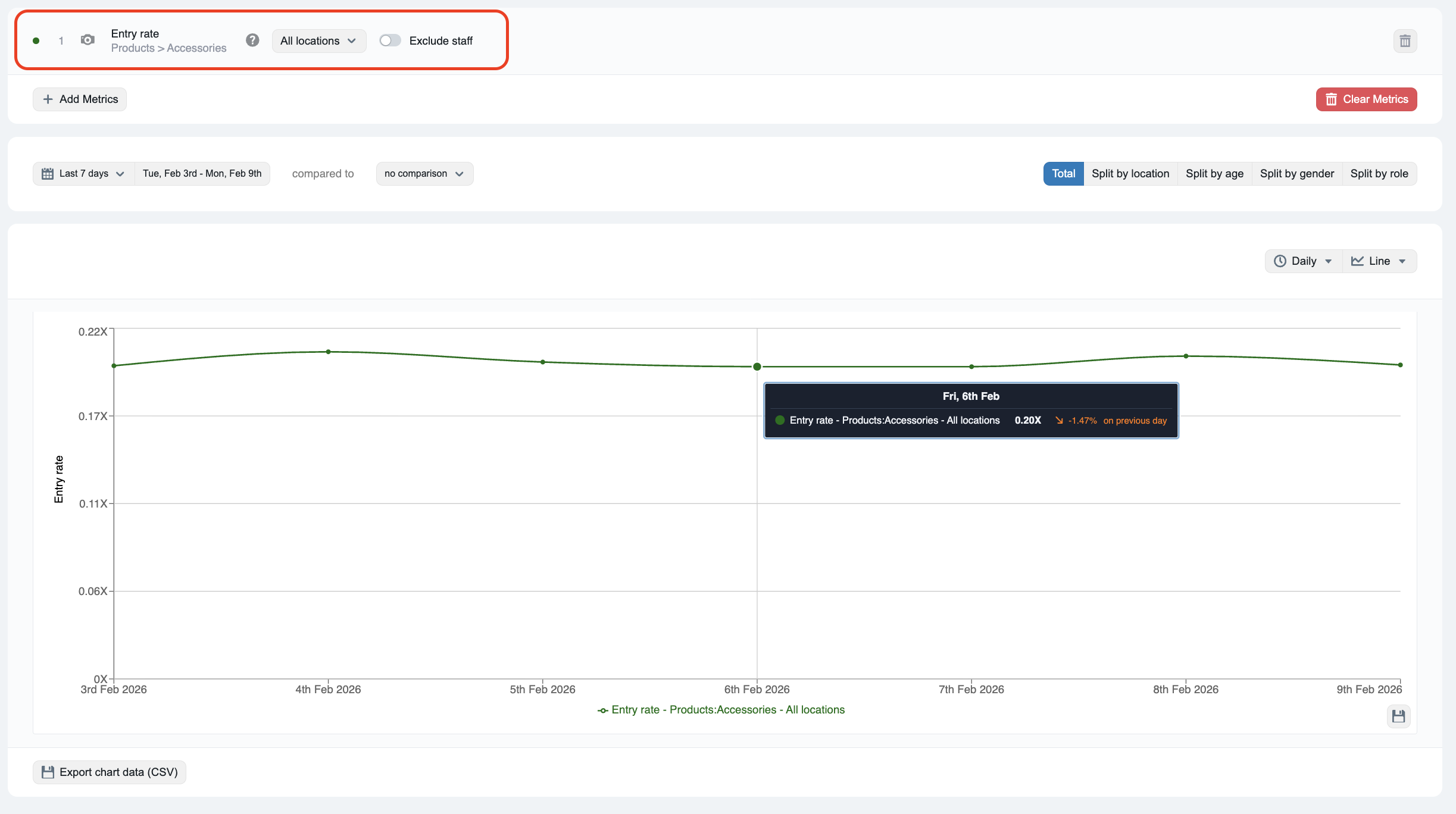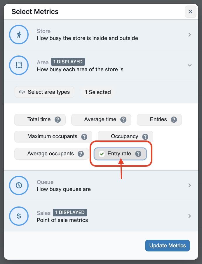 This is the proportion of total store entries that enter an area. Entry Rate = Area entries / Total store entries.